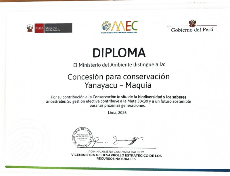 Le 24 février, nous avons célébré une étape très importante : la reconnaissance de la concession de conservation Yanayacu-Maquía comme OMEC par le Ministère de l’Environnement du Pérou. Une OMEC (Autre mesure de conservation efficace )C’ est une reconnaissance internationale définie par la Convention sur la diversité biologique (CDB) de l’ONU. 🌿